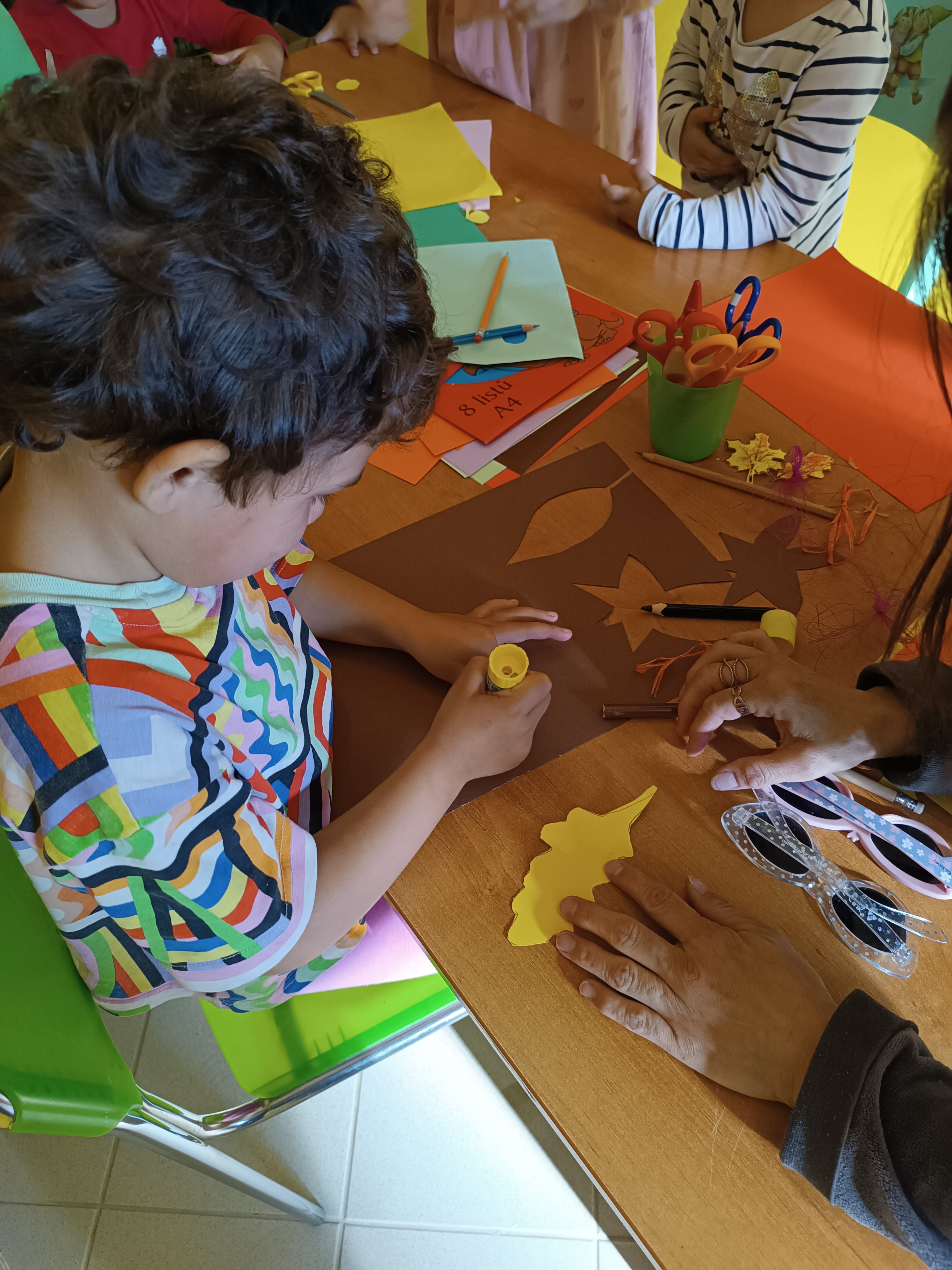 Říjnové podzimní odpoledne si děti zkrátily tvořením skřítků z listů a papírů, učily se stříhat a rozvíjet jemnou motoriku.